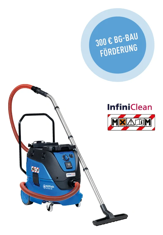 Die Nilfisk M-H-Klasse Sicherheitssauger bieten Ihnen die perfekte Lösung, wenn es um die Aufnahme von gesundheitsgefährlichen Stäuben geht. Diese Maschinen, ausgestattet mit einer Gerätesteckdose, ermöglichen es den Staub direkt an der Entstehungsstelle aufzusaugen. Die Modelle ATTIX 33 und ATTIX 44 überzeugen unter anderem durch das innovative Filterabreinigungssystem InfiniClean™. InfiniClean™ hilft Ihnen Ausfallzeiten, hervorgerufen durch Wartung und Reinigung des Filters, deutlich zu verringern und die Filtereffizienz des Staubklasse M-H Filterelementes konstant auf einem hohen Niveau zu halten.