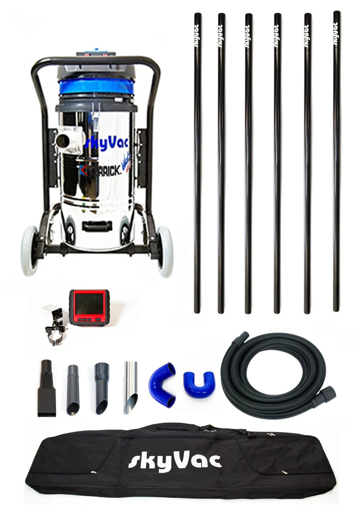 The powerful 3 motor wet dry vacuum quickly eats away at moss, mud and debris that builds up over time in gutters, making it ideal for heavy duty use on domestic and commercial properties, retail outlets, factories, schools, offices and hospitals. Removing the need for ladders, scaffolding and cherry pickers (which are time consuming and OH&S risks), the SkyVac gutter vacuum system allows work to be carried out at extreme heights by simply attaching the relevant poles and nozzles to the vacuum hose. Unit comes with assorted tools, wireless camera and inspection monitor to make vacuuming gutters as safe and easy as possible.