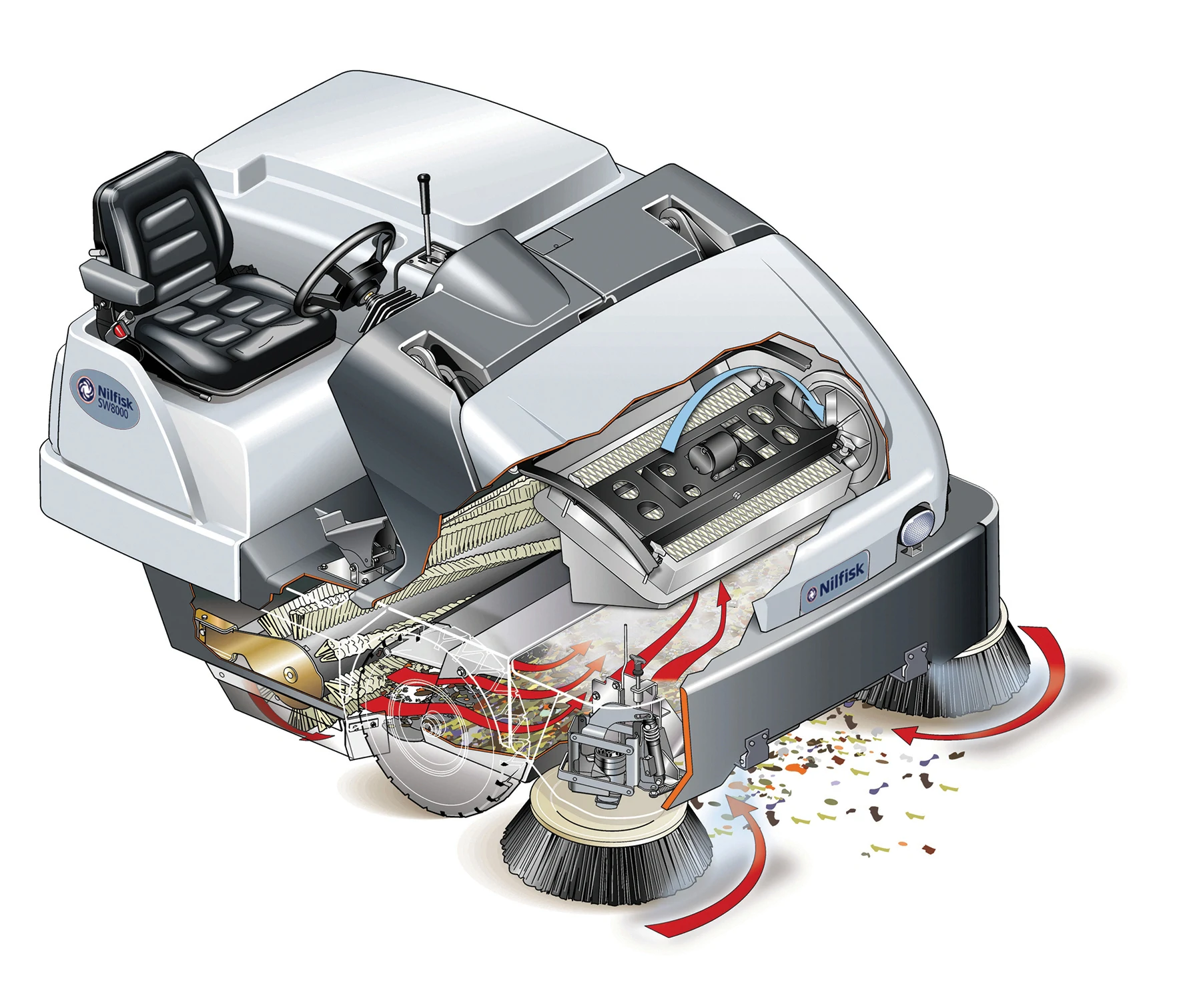 The Nilfisk SW8000 puts you in the driver’s seat of the most advanced and innovative industrial class ride-on sweepers.With its extraordinary 2 metre wide sweeping path, the SW8000 lets you sweep and clean large areas,such as car parks, warehouses and factory floors.
