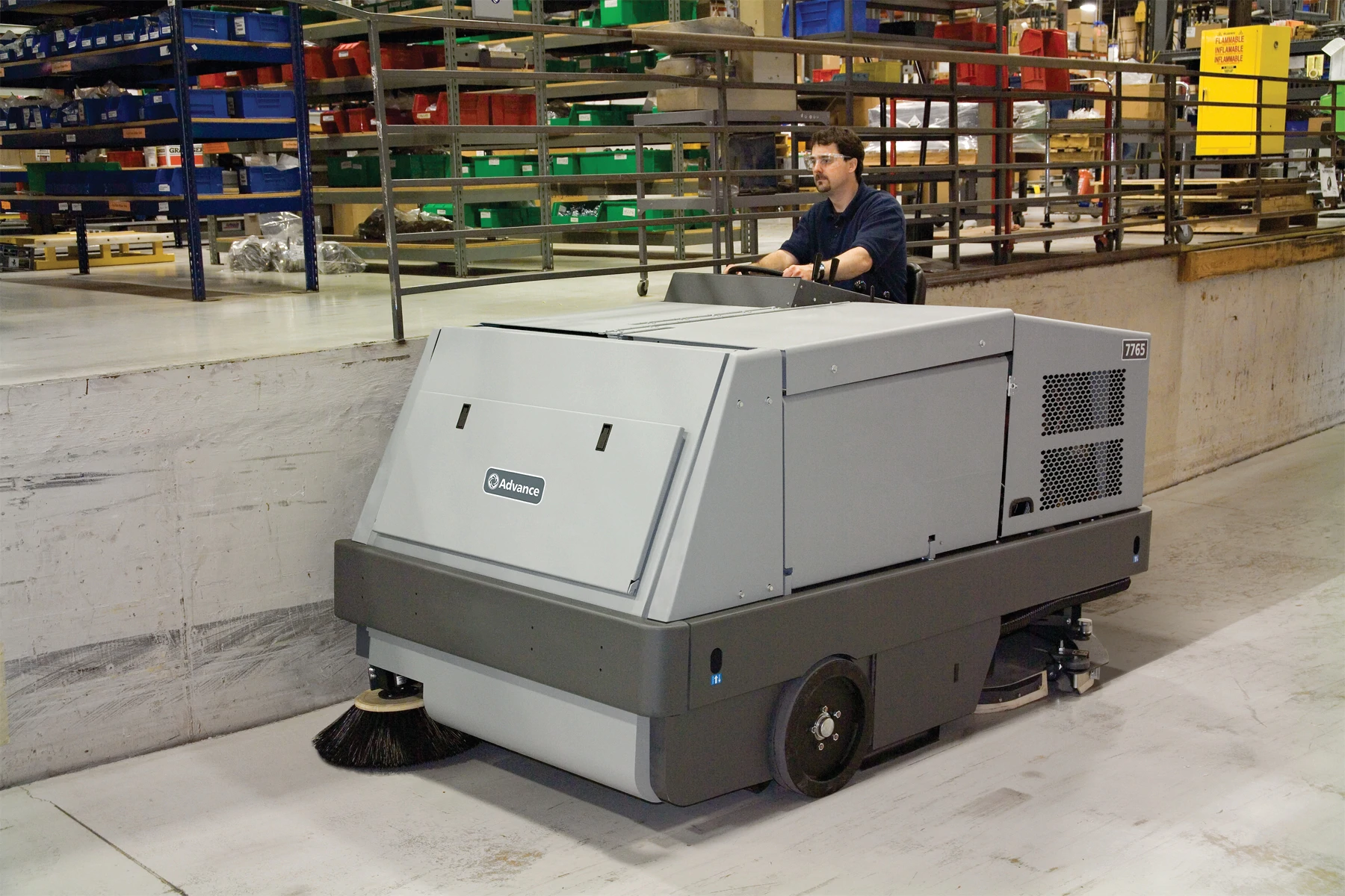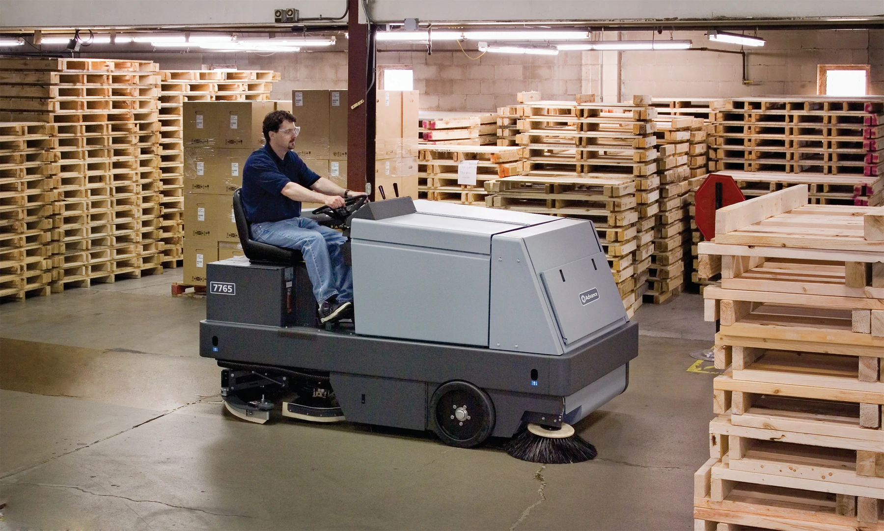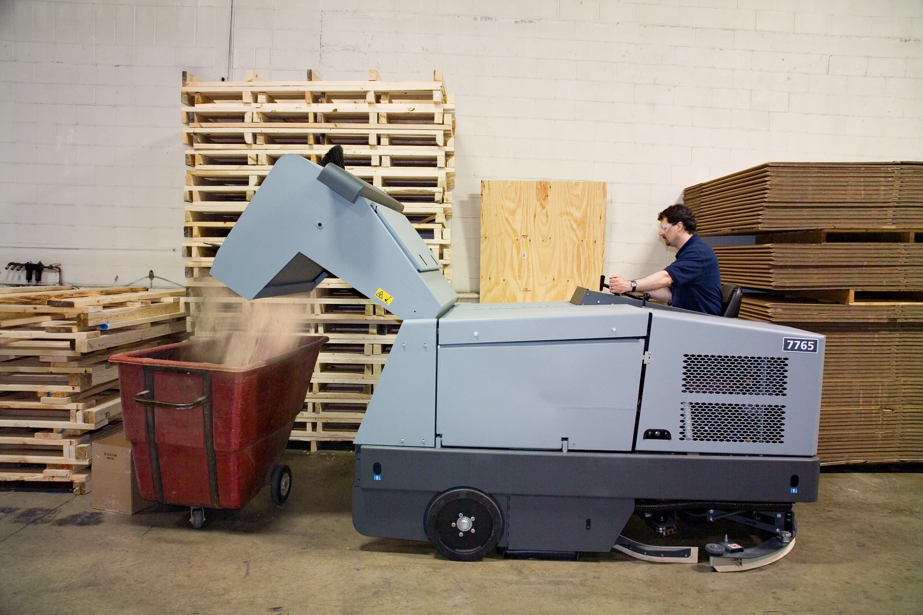The 7765™ Industrial Rider Sweeper-Scrubber is two machines in one, with an independent dry sweeping system that picks up dirt and debris before the scrubbing brush aggressively cleans the dirtiest floors, all in a single pass. Take on the toughest cleaning jobs with confidence.