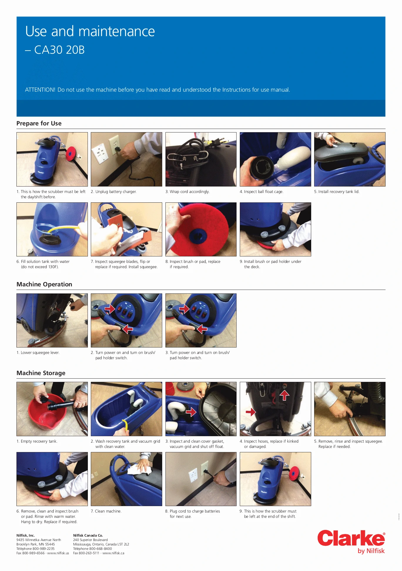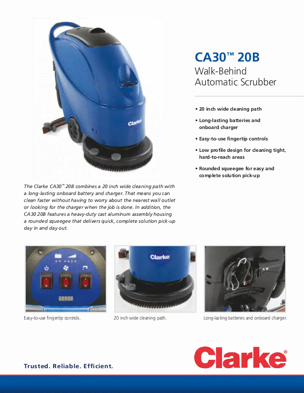 Keeping your floors sparkling clean doesn’t have to be a complicated hassle or a messy, mop-and-bucket chore. Featuring a 20-inch wide cleaning path and easy-to-use, fingertip controls, the Clarke® CA30™ 20B Walk-Behind Automatic Floor Scrubber makes floor scrubbing simple, fast and affordable.