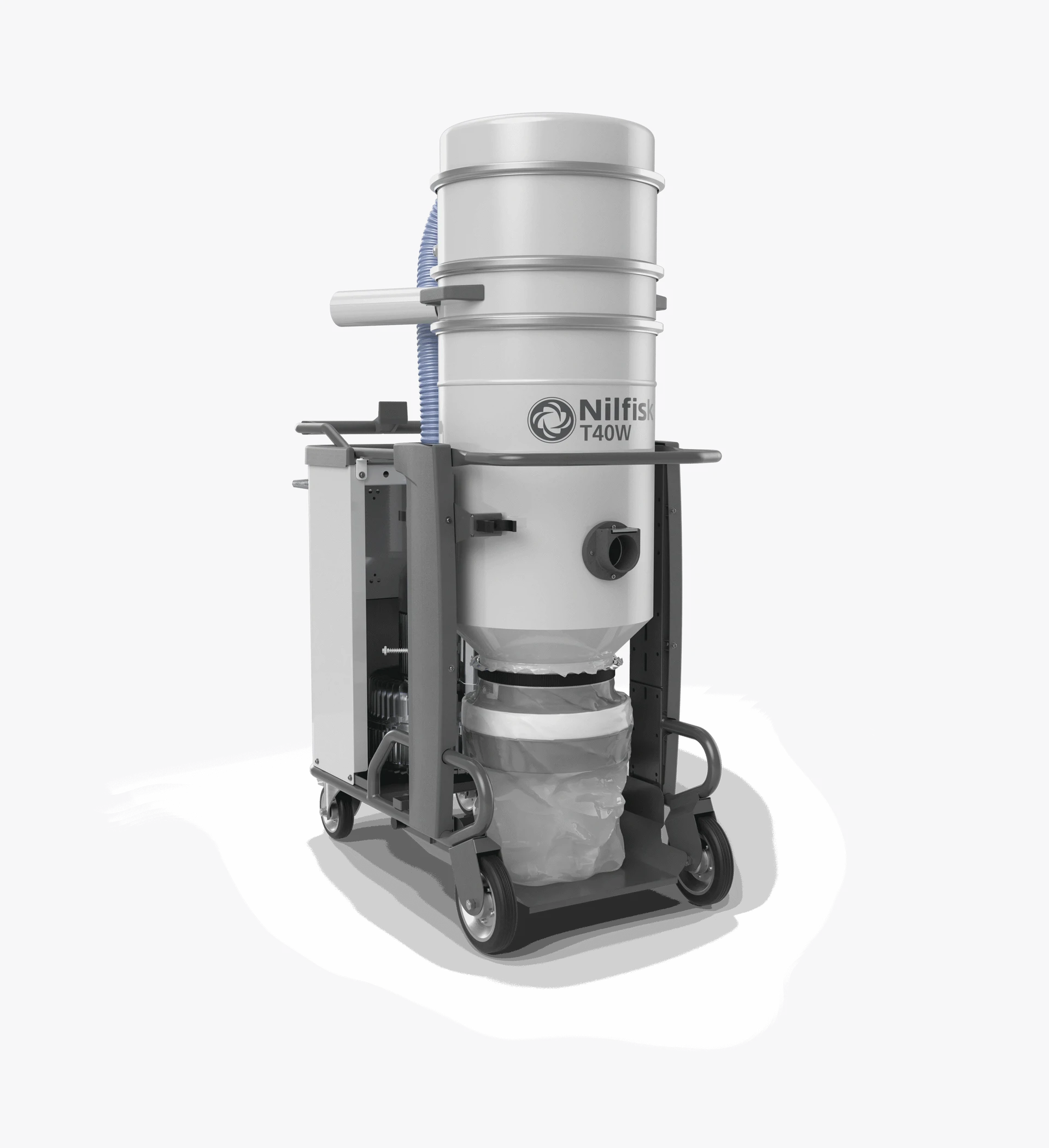 Model T40W is a threephase industrial vacuum generating a great airflow. This means that it is ideal to collect high quantities of production waste very fast. Equipped with InfiniClean, that is the automatic cartridge filter cleaning system, allowing the operator to have a constantly clean filter.