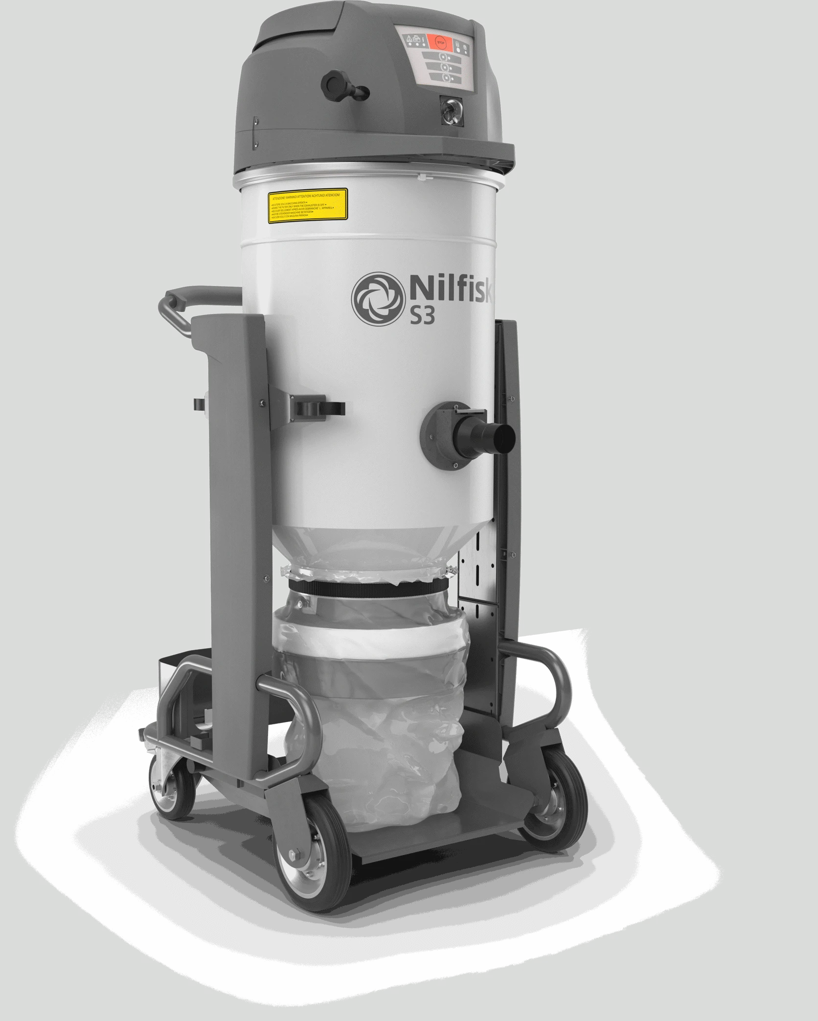 S3 to jednofazowy odkurzacz przemysłowy z 3 silnikami z układem chłodzenia „by-pass”. Wyposażony w panel sterowania zapewniający łatwą obsługę i kontrolę stanu pracy. Dostępne w wersjach z 50, 100 l zbiornikiem lub z Grawitacyjnym Systemem Rozładunku (GU)